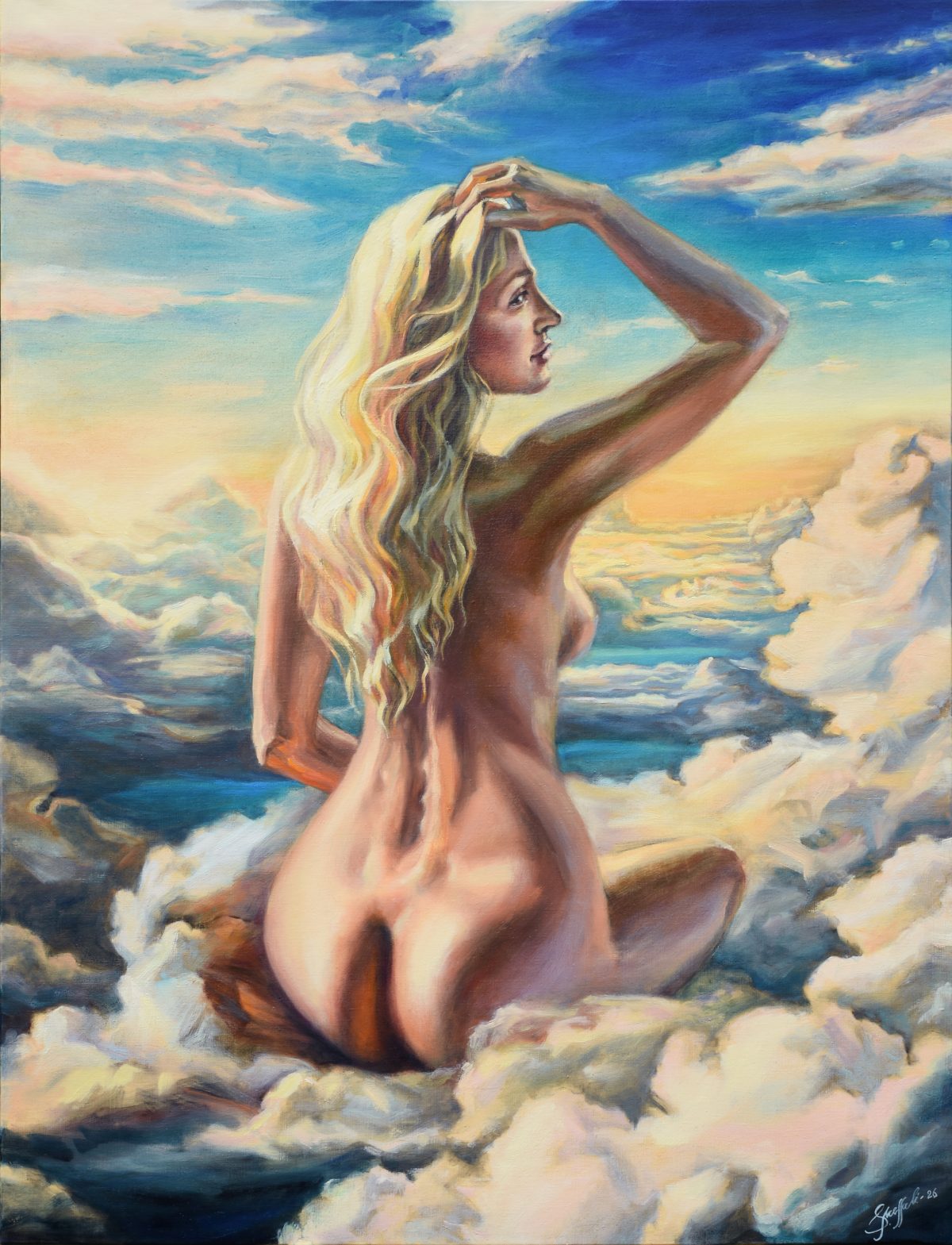 The works are painted with quality oil paints on medium-grain linen canvas, with gallery tension, on wooden stretchers. No frames.
